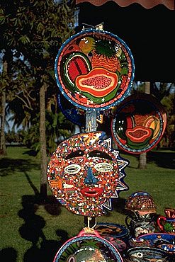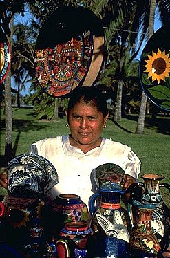 brightly painted pottery, papier mache masks and parrots, handwoven